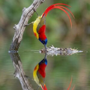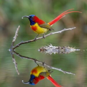 In the cool mountain forests of the Himalayas and Southeast Asia, this jewel-like nectar feeder flutters among blossoms with shimmering grace. The male glows with deep crimson,…