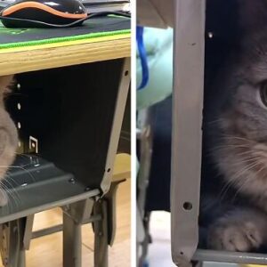 Cute Munchkin Cat Quietly Attends Class With Owner While Inside The Desk