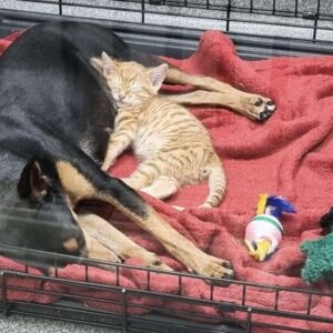 At The Vet A Kitten Sneaks Out Of Its Crate To Comfort A Scared Dog