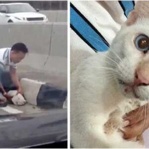 Man Saves Stray Cat Cοwerinɡ In the Μiԁԁle οf Вսsy Ηiɡhway…