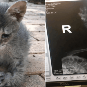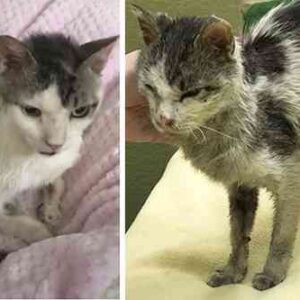 Following the sound, she discovered a tiny gray kitten wandering timidly around her yard. The poor little thing was clearly in distress—its movements awkward and labored, as…