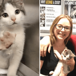 At an animal shelter in Hamilton, Ontario, a tiny kitten sat behind a glass door, doing something that quickly caught everyone’s attention. Every time someone walked past…