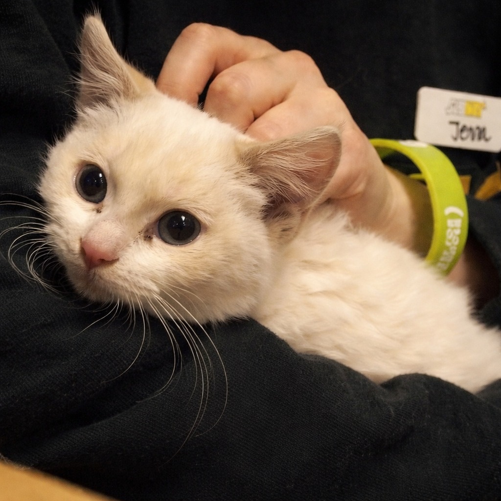 Behind a sandwich shop in freezing November air, a tiny white cat hid beside a dumpster, too weak to cry, too cold to run. Her small body…