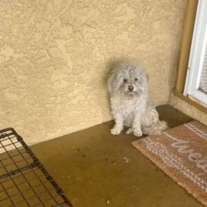 In the middle of a rainy week in Southern California, a small white dog was seen walking up to every doorstep in the neighborhood. Her tiny paw…