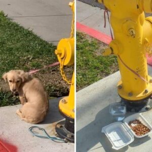 On a quiet street in Southern California, a small puppy sat motionless beside a fire hydrant. Her leash was tightly wrapped around the metal post, leaving her…
