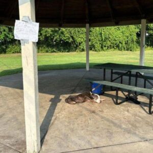 At a quiet park in Syracuse, New York, a gray-muzzled dog lay beside a wooden picnic bench, his body still and tired. His leash was tied securely…