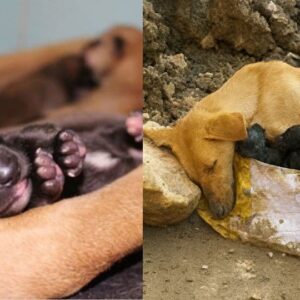 A tiny mother dog lay in the dirt with her newborn puppies tucked tightly against her chest. She had given everything she had to bring them into…