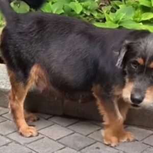 He was only a tiny puppy, and the world already felt too big. His little black body trembled on the cold dirt, like he was trying to…