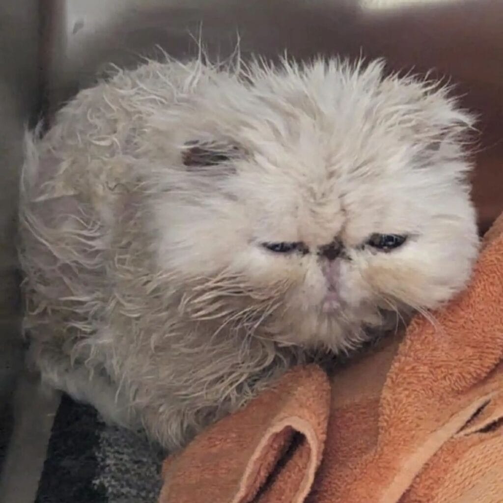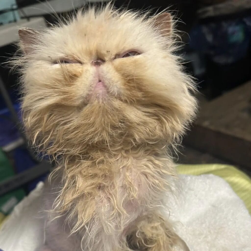 The tiny Persian was discovered alone in a busy parking lot, scruffy, frail, and barely able to open his eyes.