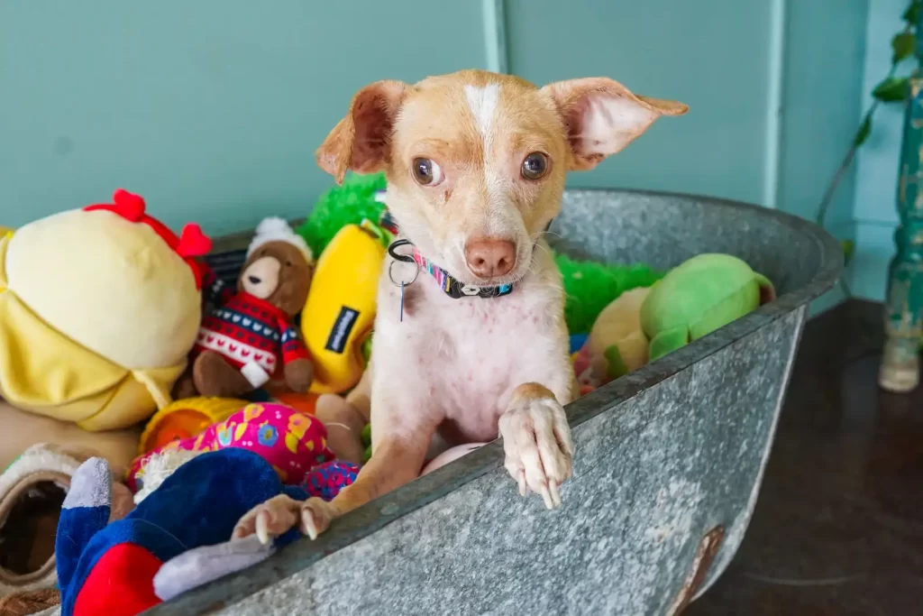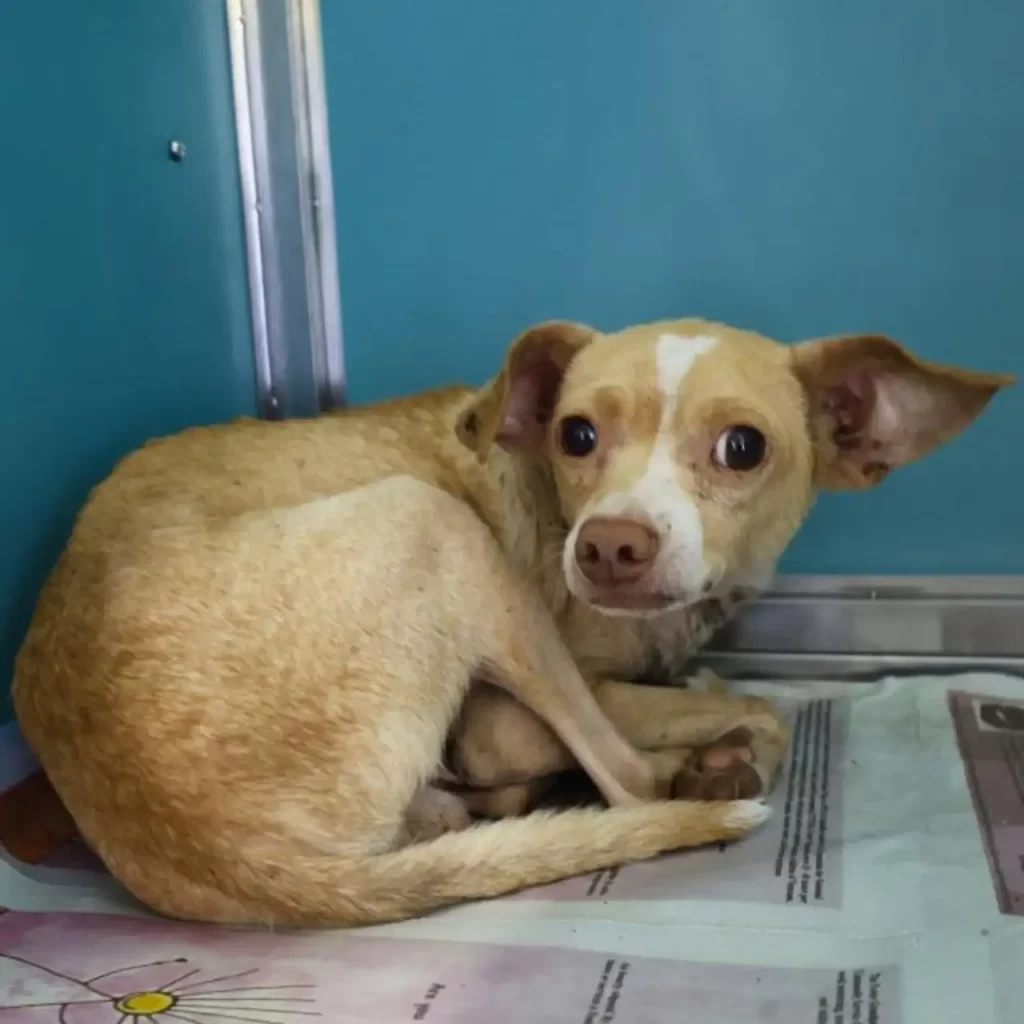 Curled in the far corner was a tiny dog, about 14 pounds, barely holding on. His fur was thin and patchy, his eyes dull, and his body covered in fleas and ticks.