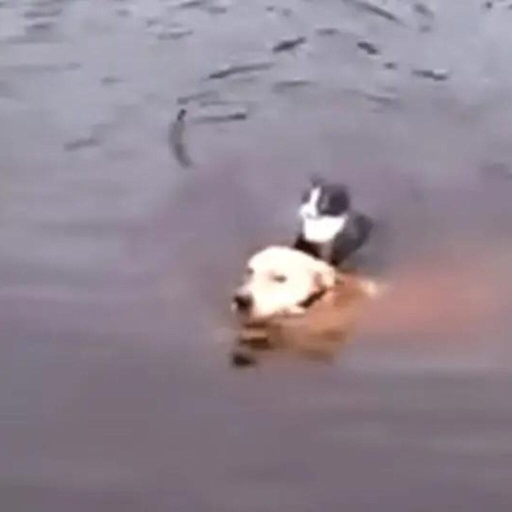 You can almost feel the determination as he swims toward the frightened feline.