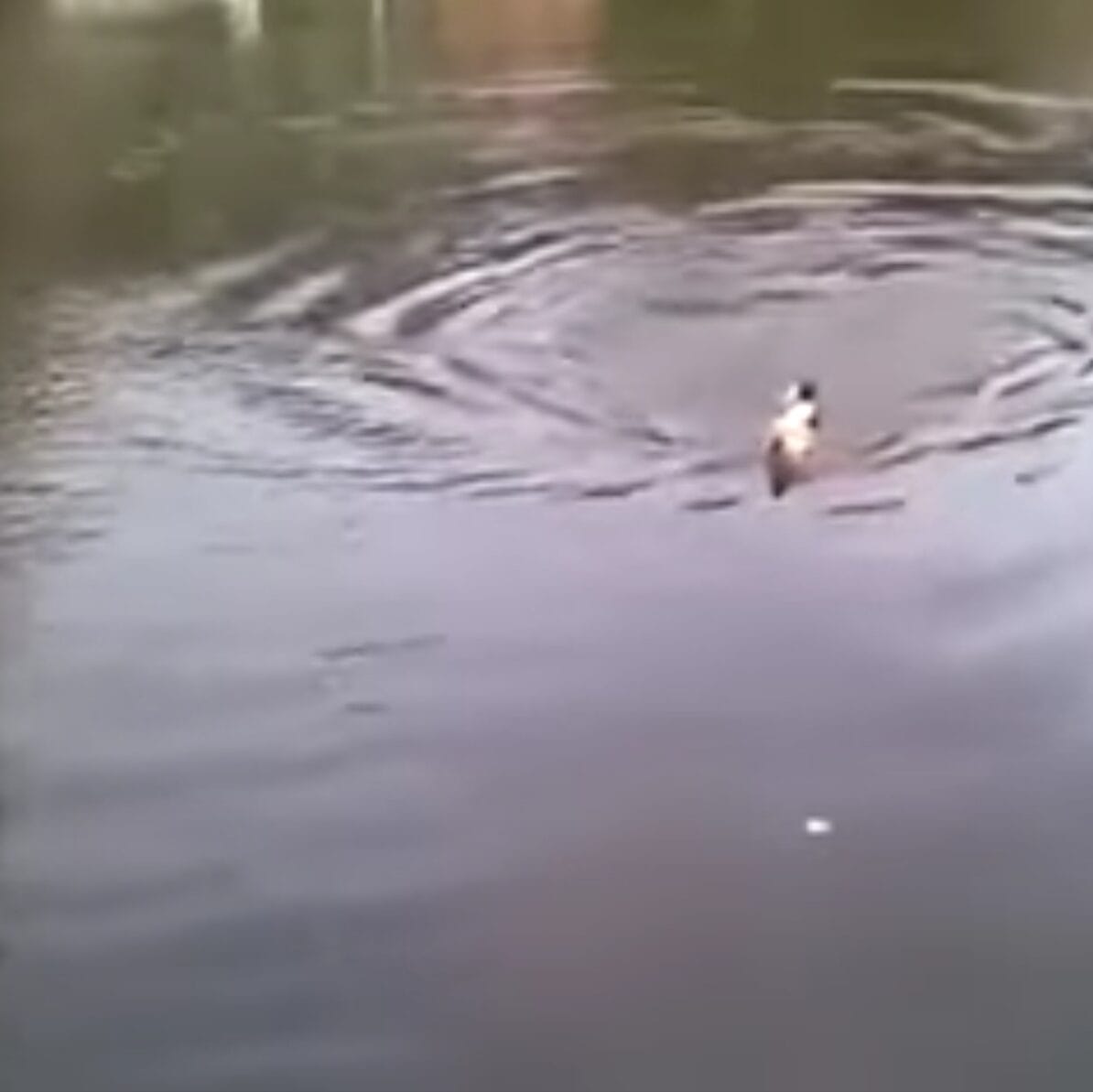 The cat is seen paddling frantically, clearly exhausted. The water ripples as it tries to keep its head up.