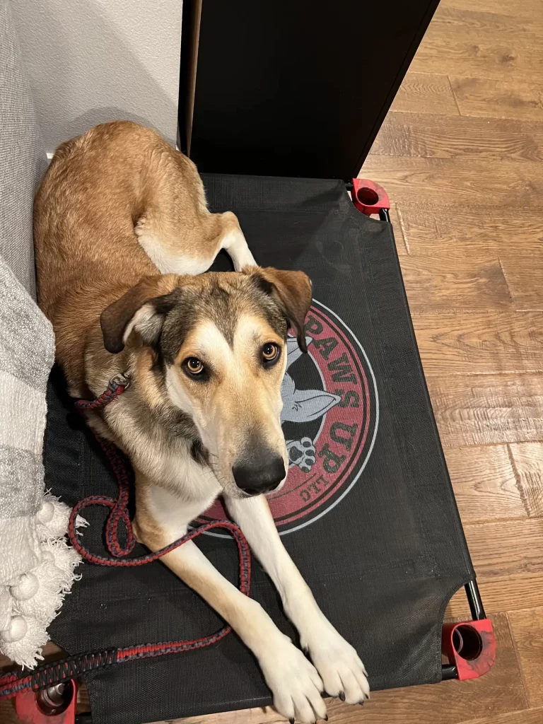 It didn’t take long for S’mores’ fosters to realize he had probably never lived inside a house before. Everyday sights and sounds seemed new to him — the hum of a refrigerator, the clink of dishes, the comfort of a soft dog bed.