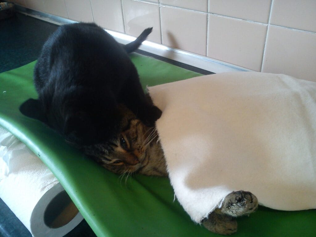 Whether it’s cuddling, purring softly beside them, or even grooming them, his presence offers a soothing balm to his furry patients.