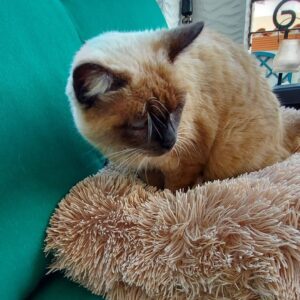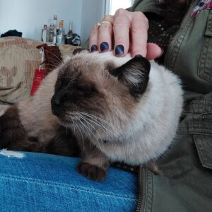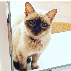 When Cheryl went into lockdown, the cat started coming to visit her on and off. She would cry outside the doors and beg Cheryl to let her in. Because she is just so soft and cuddly, Cheryl called her Squishy. The cat would stay with her family all day and would follow her wherever she went.