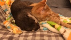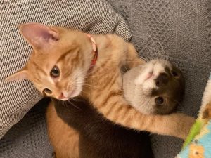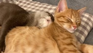 A sleepy otter cuddling a kitty, it really doesn’t get much cuter than that.