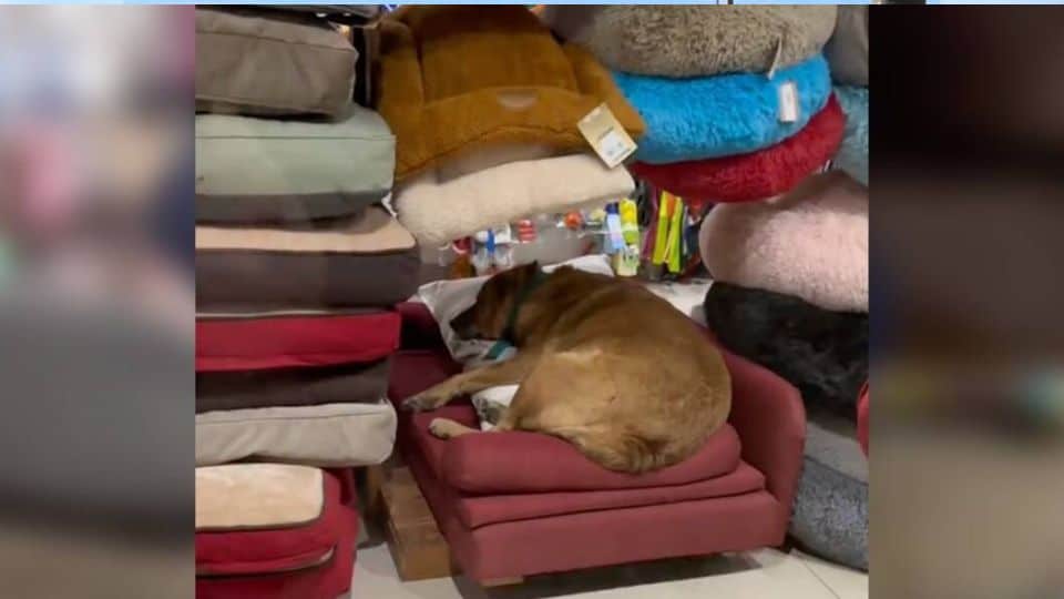 Exhausted Stray Dog Finds His Way Into a Pet Store And Curls Up on the Comfiest Bed