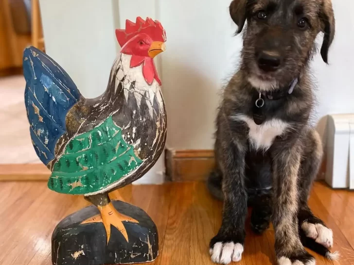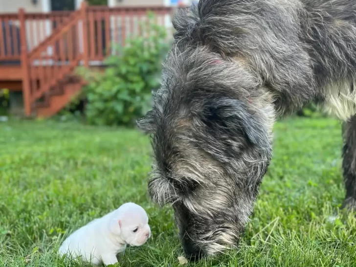 Though only 10 months old, Chicken was already much larger than the pup. Still, her size didn’t scare the little one. Instead, Chicken approached with a gentle demeanor, engaging in a brief, friendly play session before continuing inside with Krieger.