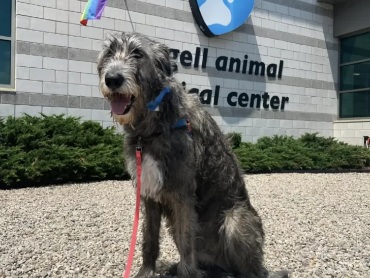 While most animals that come through the doors of MSPCA-Angell are searching for a forever home, one special Irish wolfhound named Chicken visits with a different purpose — to make new friends.