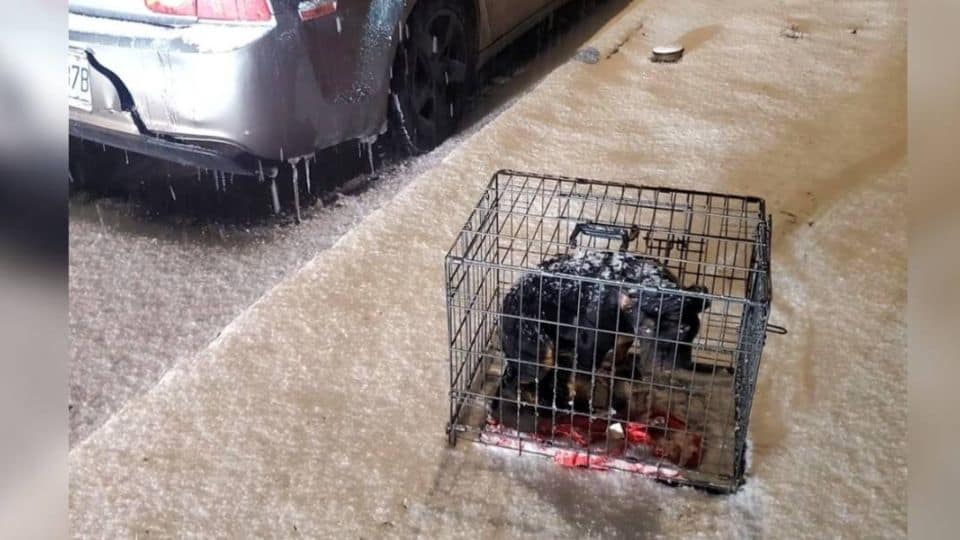 When Angel finally arrived, her headlights illuminated a heartbreaking scene — a cage buried in snowdrifts, and inside, a small dog trembling but still alive.