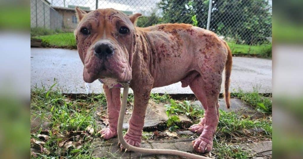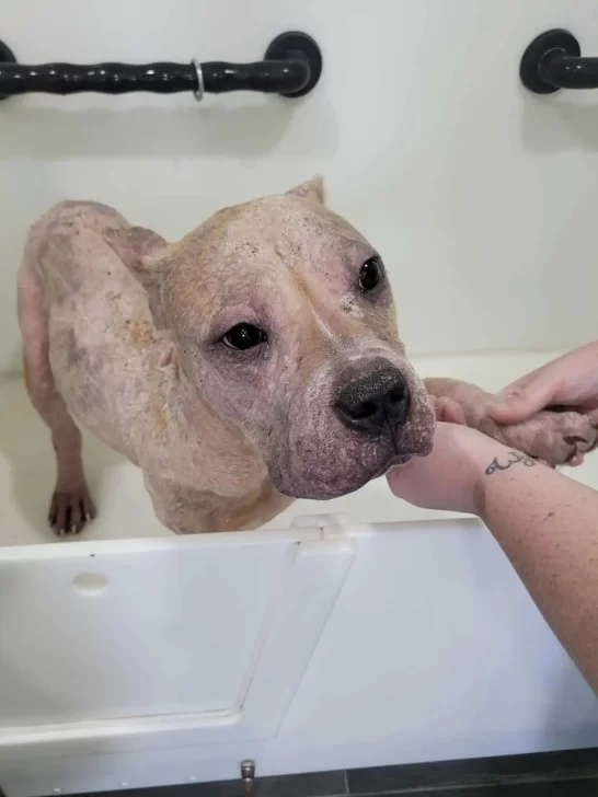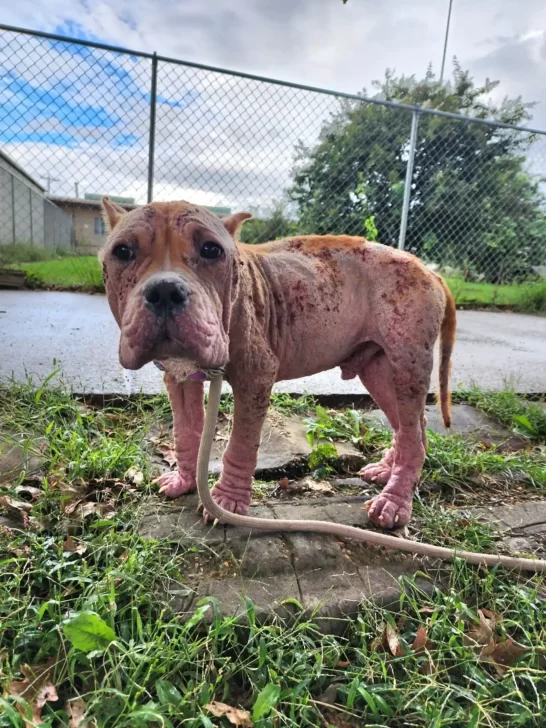 “When a dog like this has Demodex mange, it’s like their skin is melting off. The Demodex mites cause the hair to fall out, and then the skin becomes raw,” Steffen explained to The Dodo. “Mange like this is slow to progress, and finding a dog in this condition speaks to the neglect of its former owner. Despite everything, he was quiet from the pain but still wagged his tail.”