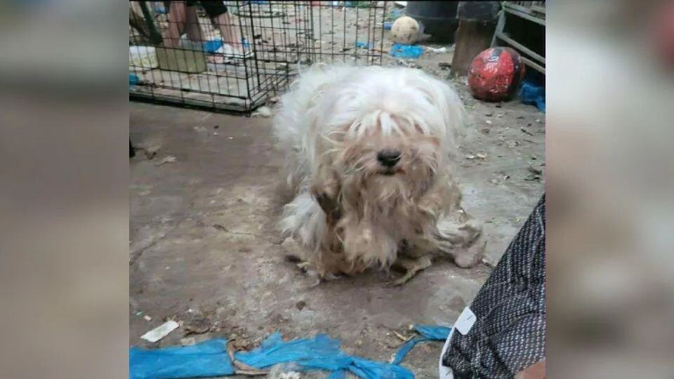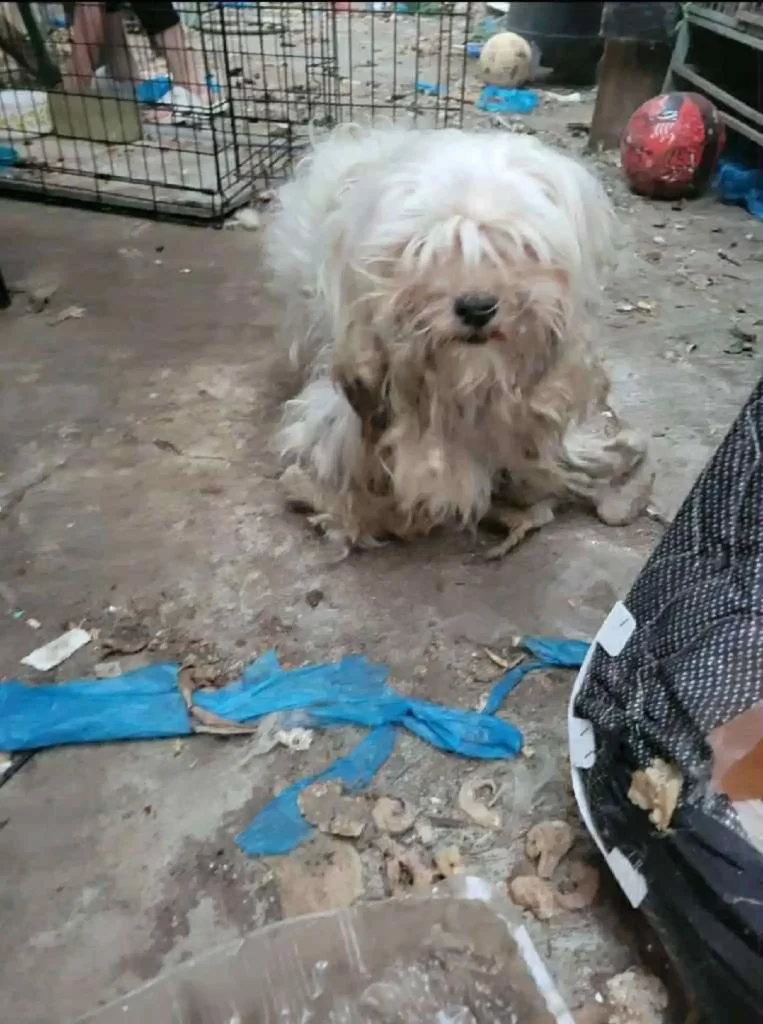 Hidden beneath piles of trash was a small white dog, her fur twisted into painful knots that hung like chains around her body.