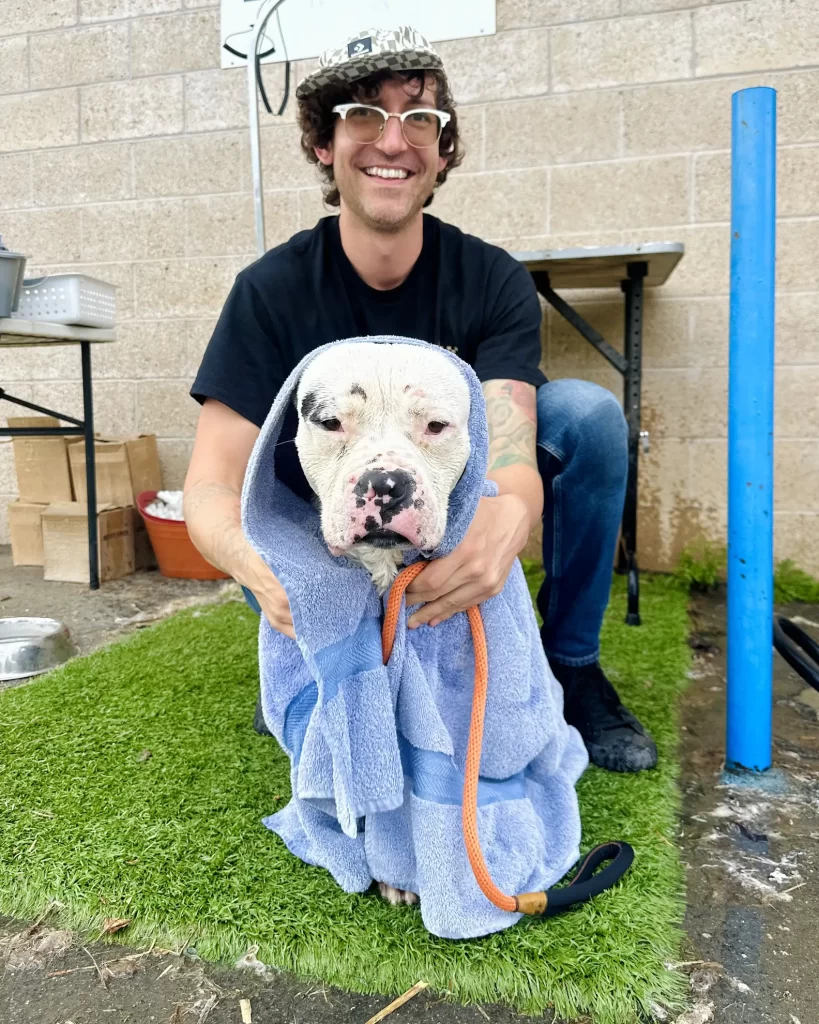 Casper’s skin needed special care, so the veterinary team gave him medicated baths several times a week. He never complained — instead, he sat still, closing his eyes as if he knew they were helping him heal.