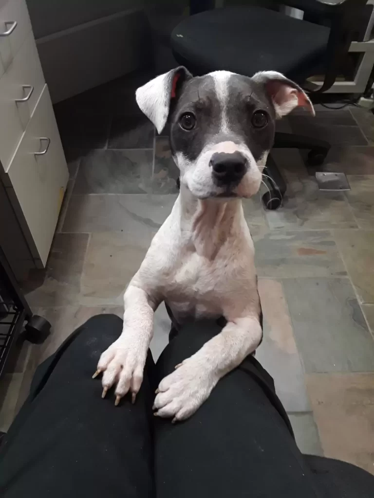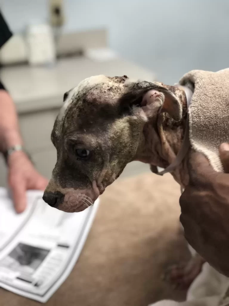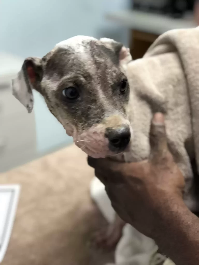 Her skin was bare and crusted, and she trembled every time someone came close. This was not what a puppy should look like.