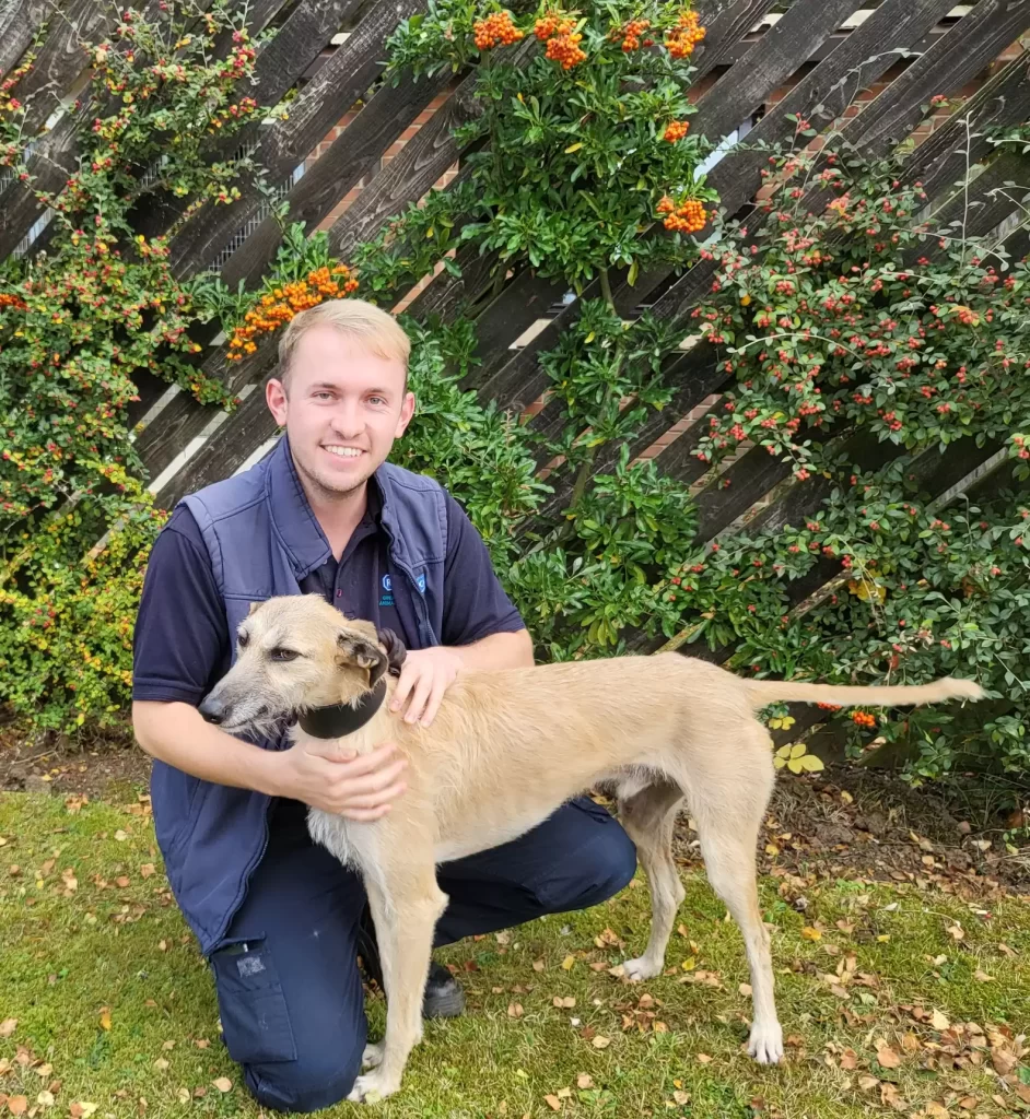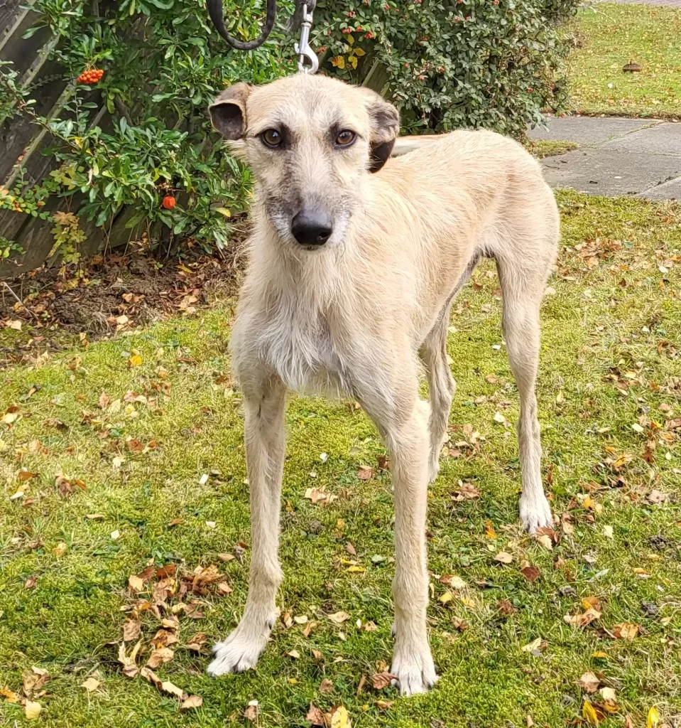 When she arrived, her eyes fell on a frail tan lurcher tucked tightly into himself, as if trying to disappear. His ribs showed through his coat, and the cold air seemed to cling to his trembling body. He looked utterly defeated, too tired to even lift his head.