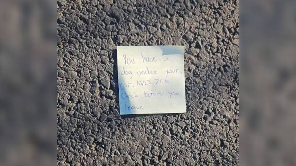 “You have a dog under your car. 10/23, 7 p.m. Check before you leave.”
