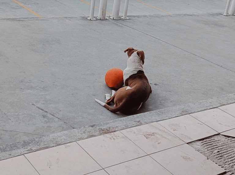 Today, the story of the playful visitor continues. He runs joyfully across the playground, chases balls with all his might, and wins hearts with every wag of his tail.
