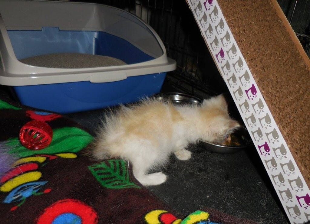 To help Jovi adjust, Mim built a two-story wire crate complete with a ramp. Within 24 hours, the little kitten had mastered it.