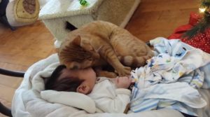 Despite their reputation for being indifferent, cats are far more capable of affection and relationships with babies than you might have once thought. If you don’t believe this, the cute ginger cat below will be one the solid proof to prove to you that cats are affectionate, gentle, and sweet.
