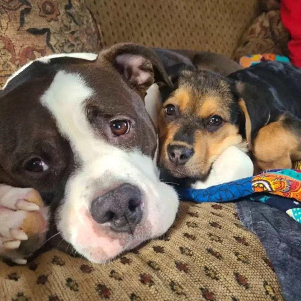 The big dog quietly approached the trembling puppy, gave a gentle sniff, and wagged his tail. It was as if he instantly understood his new role.