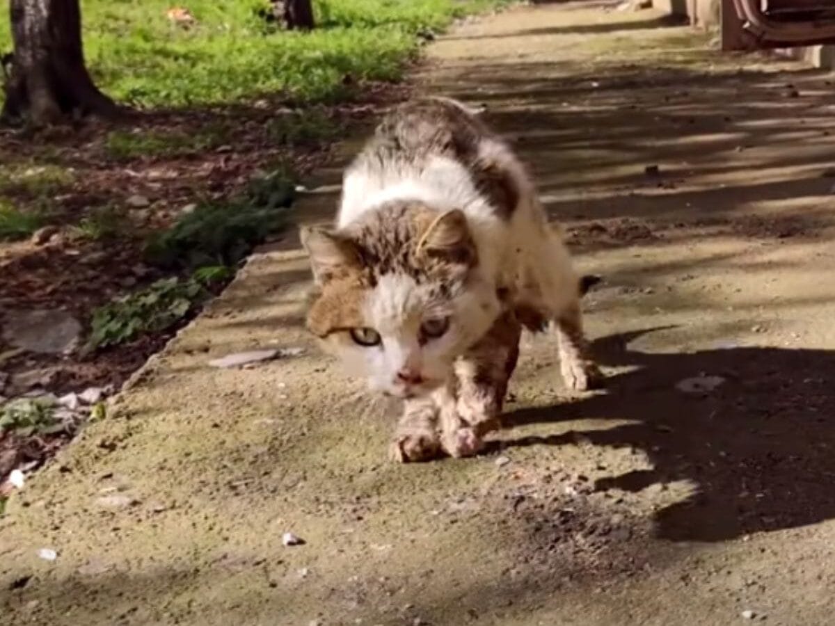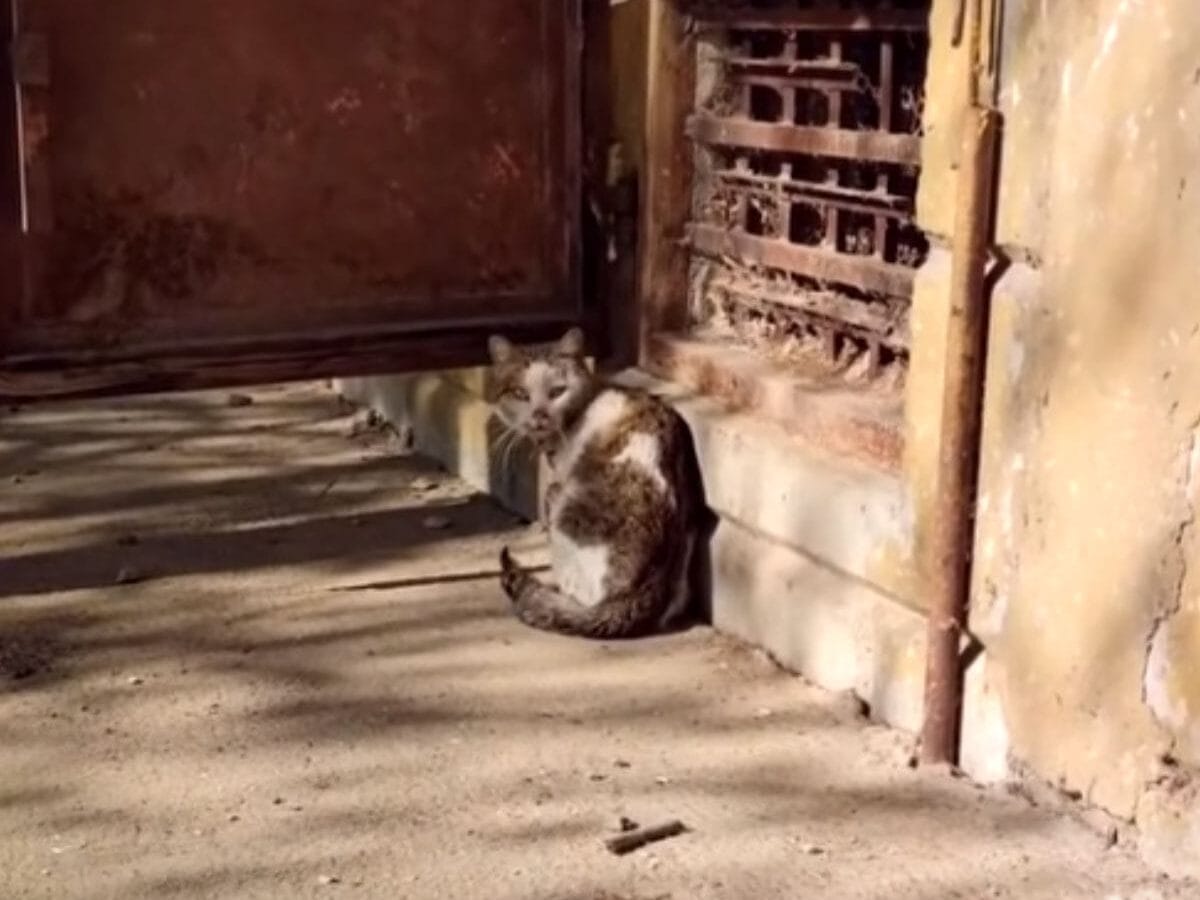 There was a cat struggling to move, clearly in pain, standing in the sun in front of an old house.