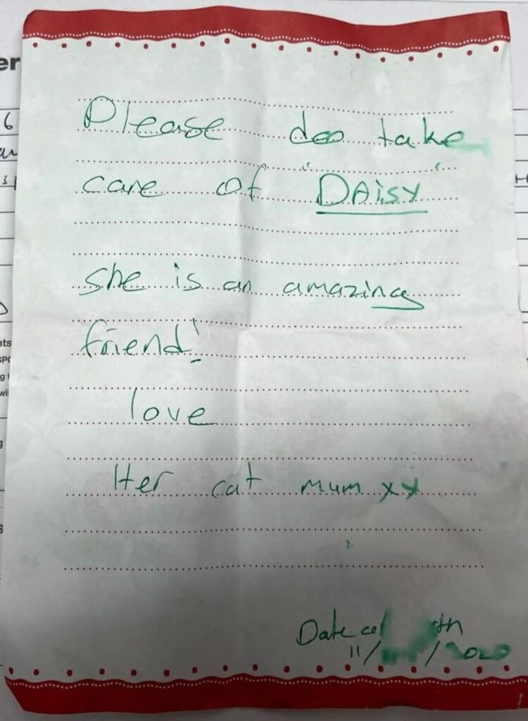 “Please do take care of Daisy,” it read. “She is an amazing friend! Love, her cat mum.”