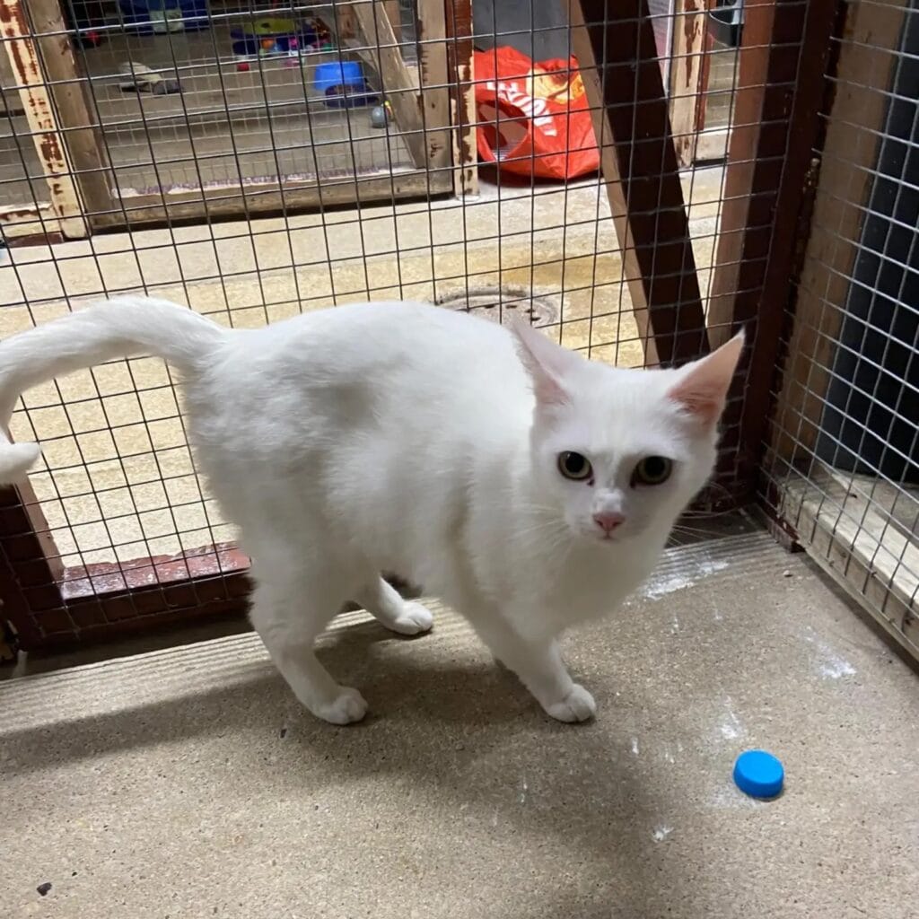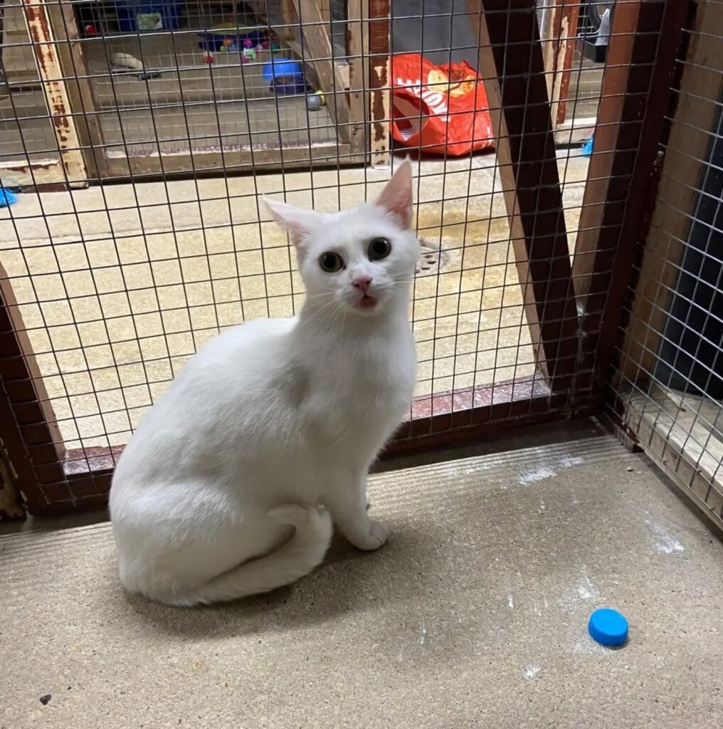 Inside was a beautiful white cat, sitting quietly and looking completely out of place. She was safe for the moment, but clearly confused about where she was and why she had been left there.
