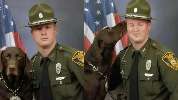 Kenobi, the Indiana Department of Natural Resources (DNR) K9 officer, and his long-time partner, Conservation Officer Levi Knach, posed for what was supposed to be a routine photo session. But Kenobi had other plans. He saw this as the perfect moment to shower his beloved handler with some unexpected affection.