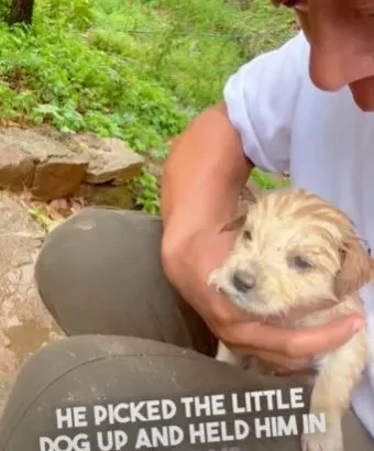 Unable to leave the tiny creature alone in such distress, he gently scooped the pup up, cradling him close as he tried to soothe his shivering body.