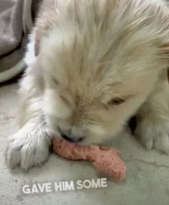 Once home, the man carefully set the pup down and offered him a warm meal, which he eagerly devoured.