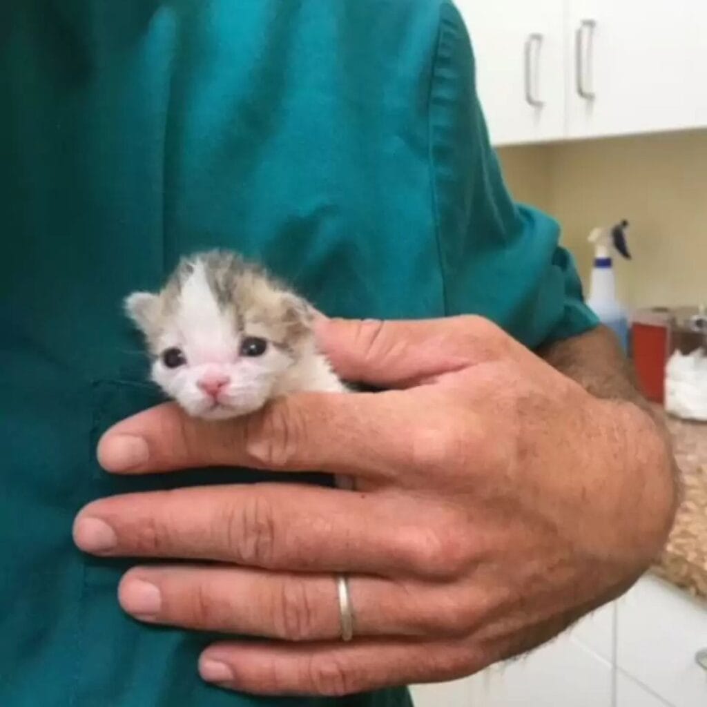 Knowing they had no time to waste, they scooped up the surviving kitten and rushed him inside.
