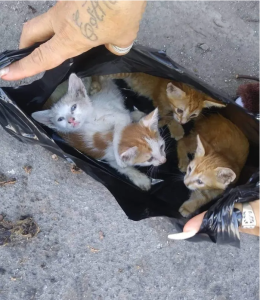 A compassionate neighborhood homeowner heard meowing and discovered four kittens in a garbage bag in an alley. “She brought them inside, fed them, and gave them water.” “They were malnourished and thirsty,” Brenda recalls.