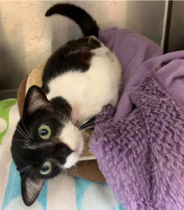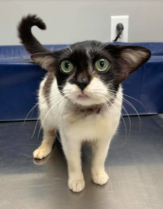 “Alisha Kidwell, MD, is treating her.” Yana Aviles, an assistant veterinarian at the clinic, describes the cat as “extremely nice and friendly.”