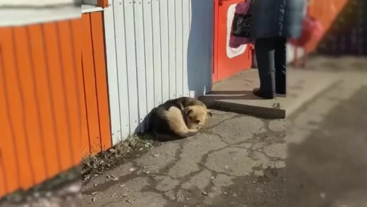 On a chilly day, a lonely pup huddled in front of a store, silently hoping for a kind soul to notice her and offer a helping hand.