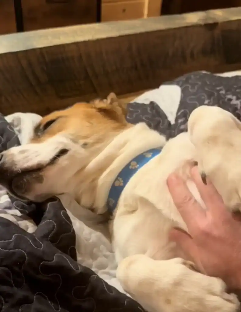 Bryson curled up happily at Krystal’s feet, trusting her fully.