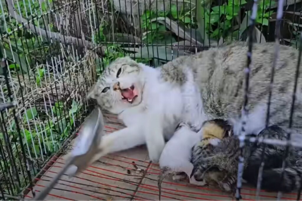 She refused to leave the cage, crouched over her babies and hissing at anyone who dared to come near.