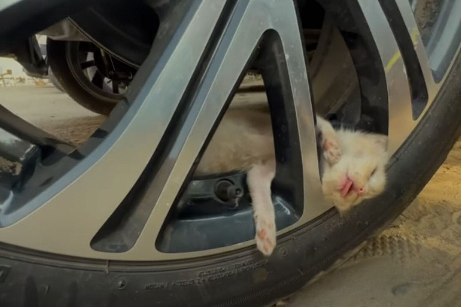 A tiny kitten was wedged between the rims of the wheel, barely moving.