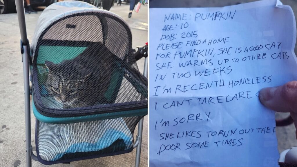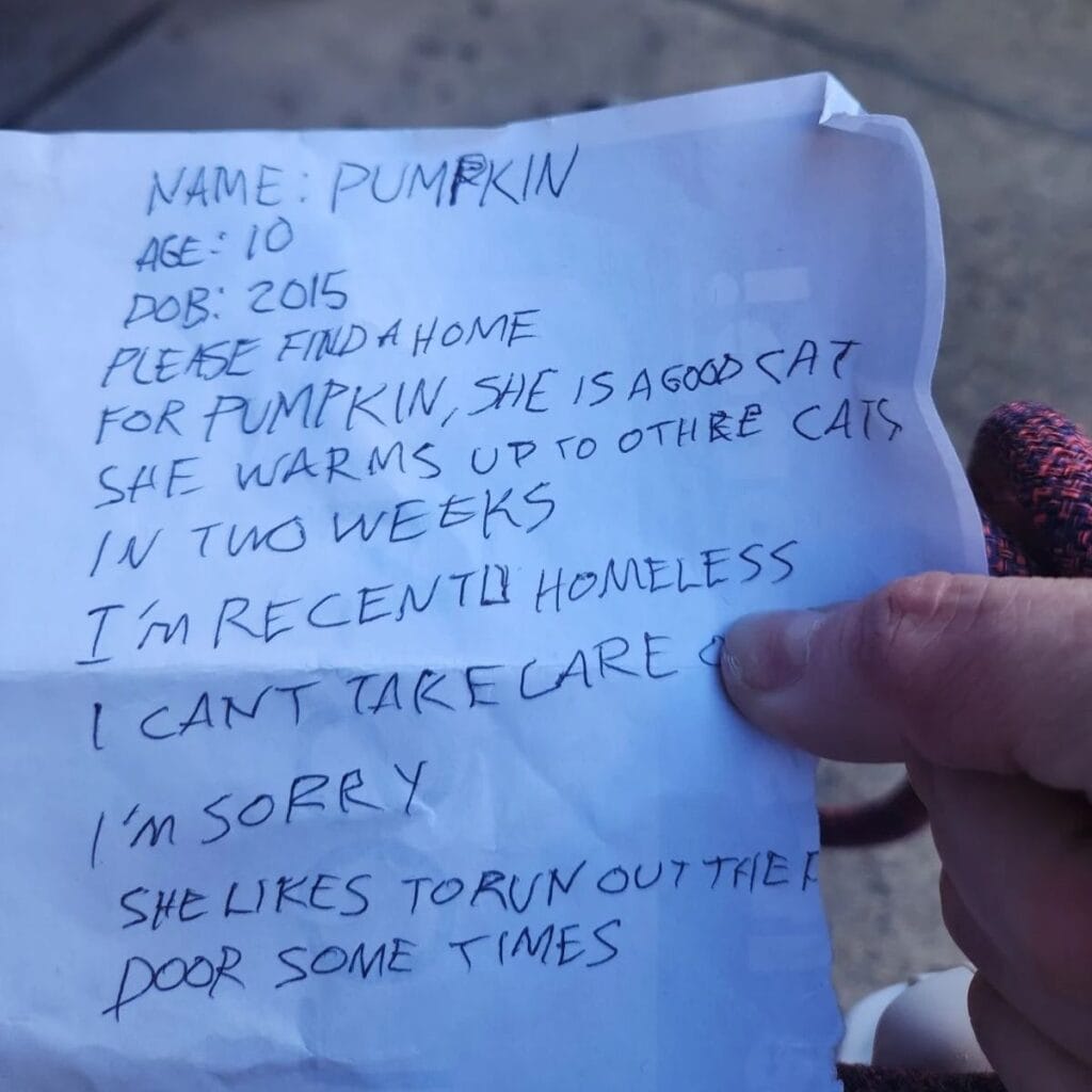 “We are heartbroken for her, but also heartbroken for her person who, facing homelessness, must have felt they had no other option but to leave Pumpkin with this handwritten plea for help.”