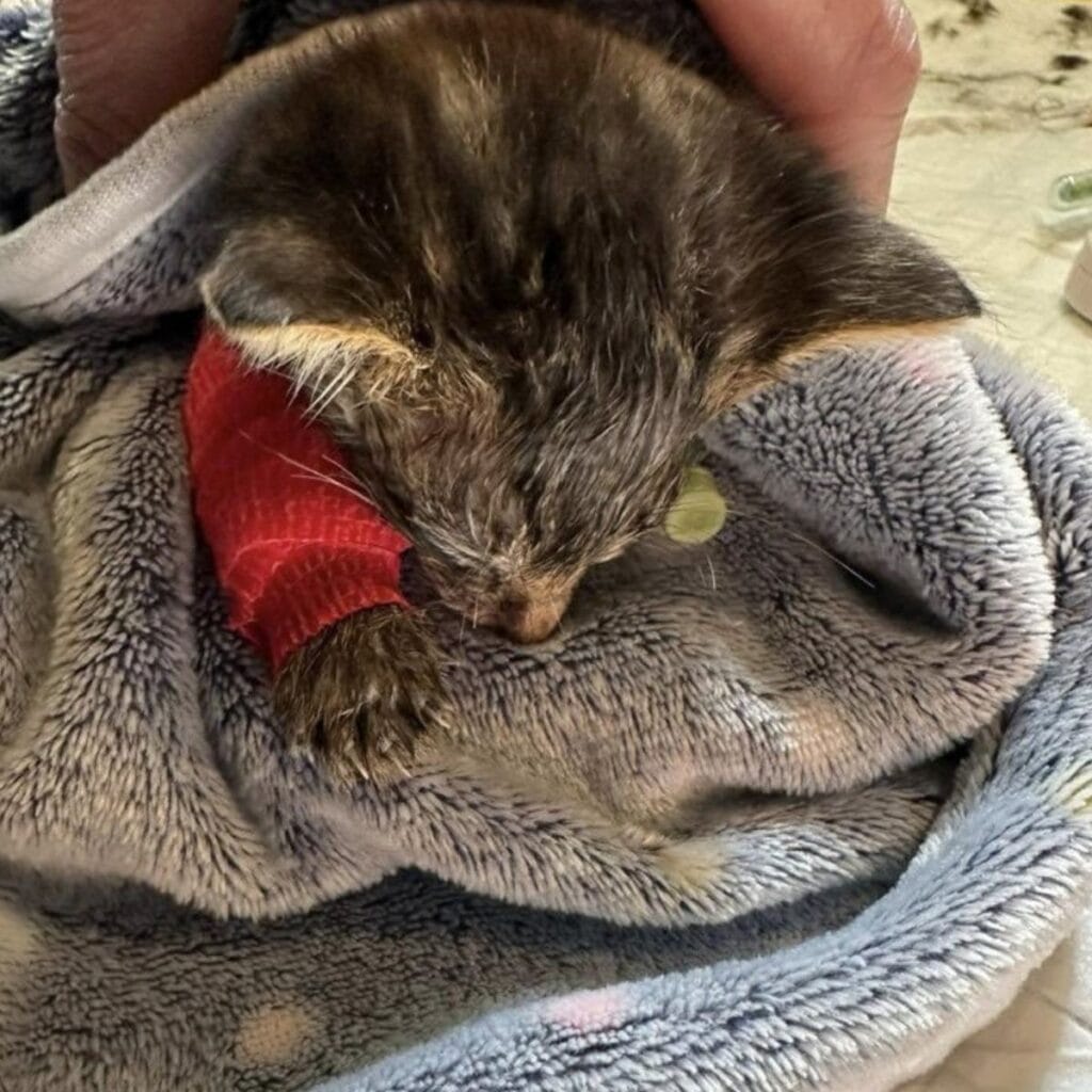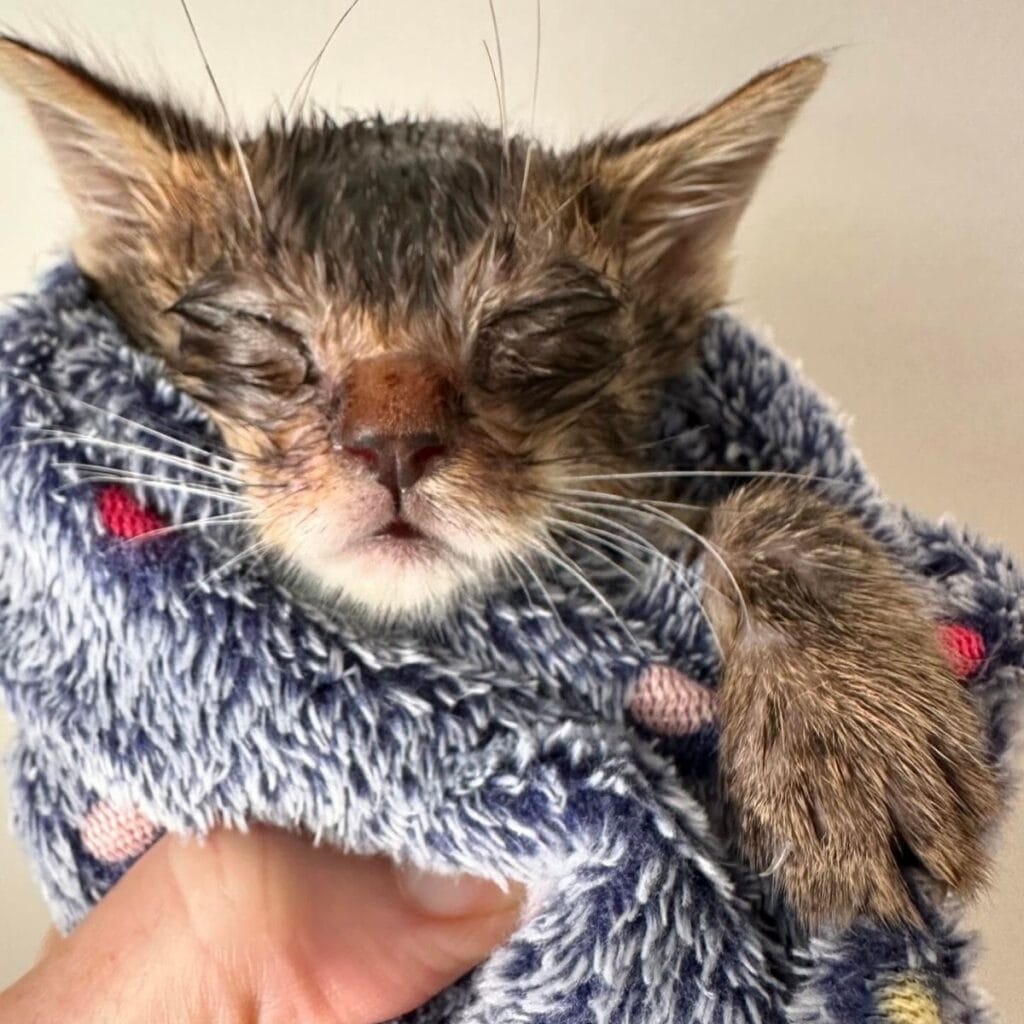 The tiny kitten was only a few weeks old but looked even smaller, her frail body hidden under layers of grime.