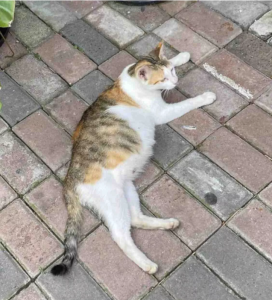 The cat looked to be friendly, as she sat outside the office building meowing at everyone who passed by and rubbing her face against anyone who paid attention to her.